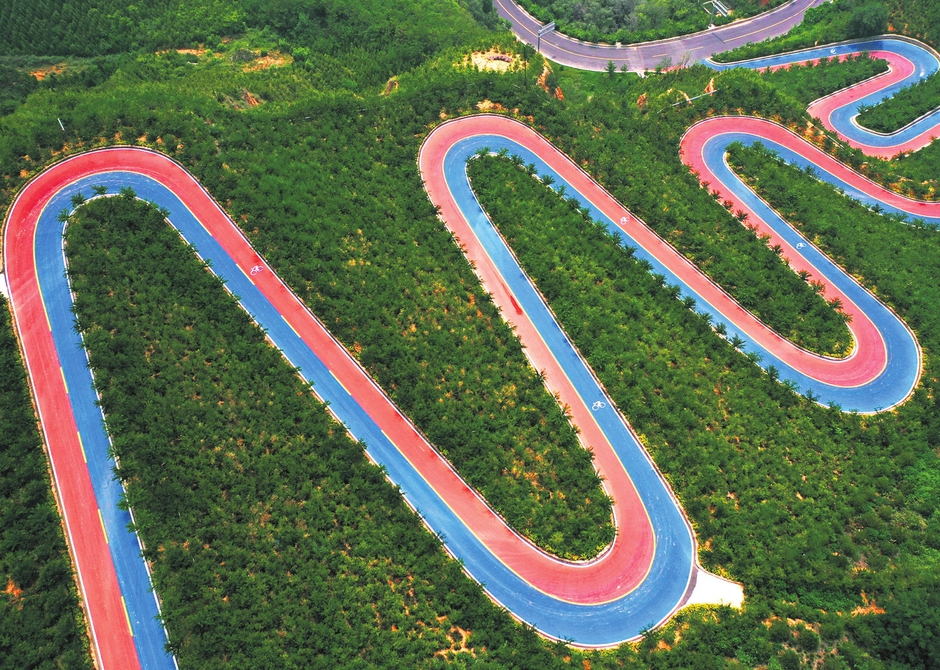 The redblue branch section of the East Mountain Sightseeing Road is designed to reach the standards of international highway cycling races. MA LIMING / FOR CHINA DAILY