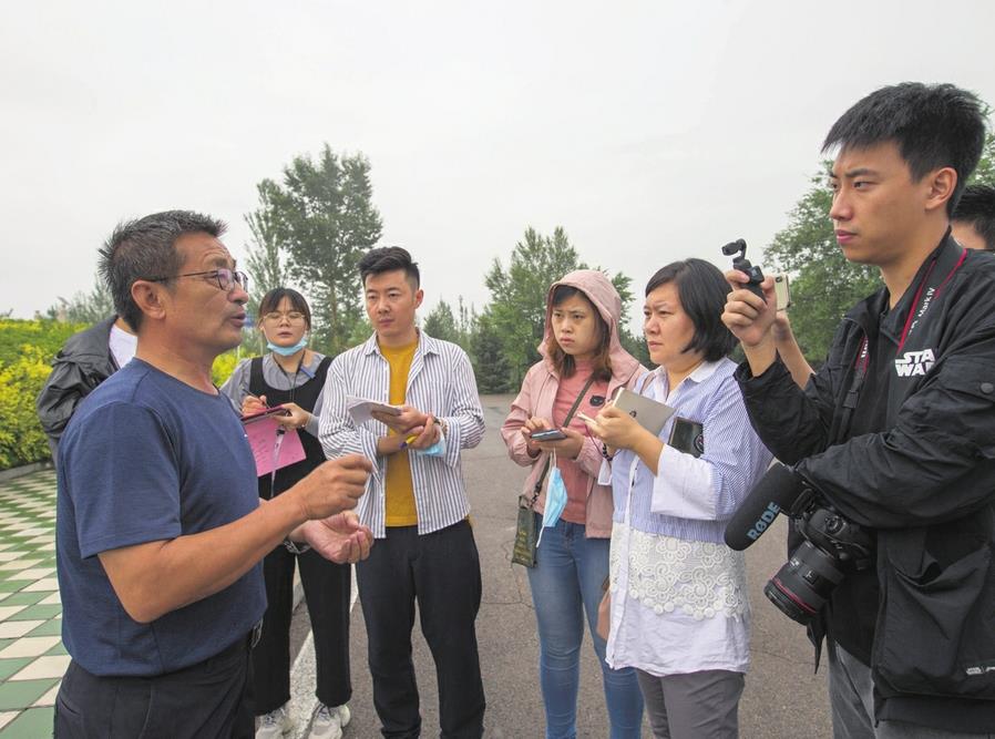 Zhao Shuzhong (left), an official in Youyu county, tells journalists about the latest progress in poverty reduction and environmental protection. ZHANG YUN/FOR CHINA DAILY