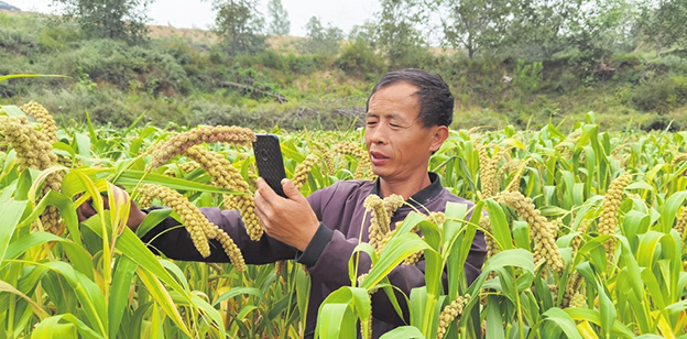 Wei Baoyu, a farmer in Lingtou village in Wuxiang county, uses his smartphone camera to demonstrate the quality of the grain at his millet farm to online customers.