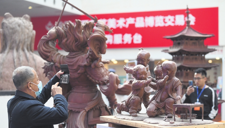 Visitors take pictures of clay sculptures at the Shanxi Handicraft Expo.ZHONG QING / FOR CHINA DAILY