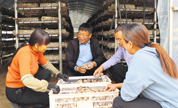 Chang Mingchang(center),a professor from Shanxi Agricultural University,teaches farmers in Linxian county how to grow edible fungi.