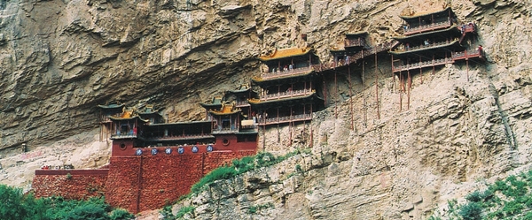 Seen from below, Xuankong Temple, which literally means "temple hanging in the sky", appears extremely precarious. It is supported only by a few thin stanchions standing on protruding rocks. For that reason, it was selected by Time magazine as one of the 10 most dangerous buildings in the world in 2010.