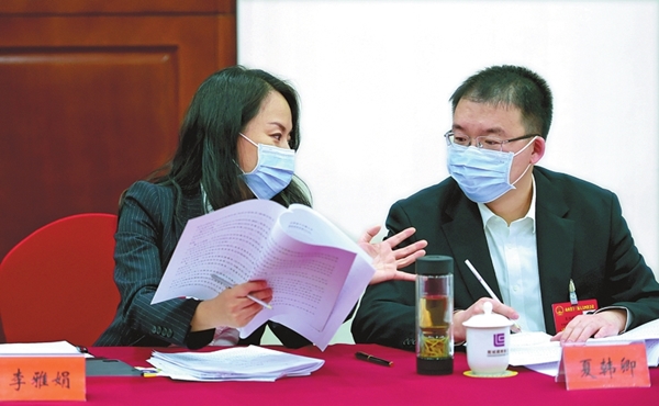 Two deputies to the Shanxi People’s Congress discuss this year’s provincial government work report.SHI XIAOBO/FOR CHINA DAILY