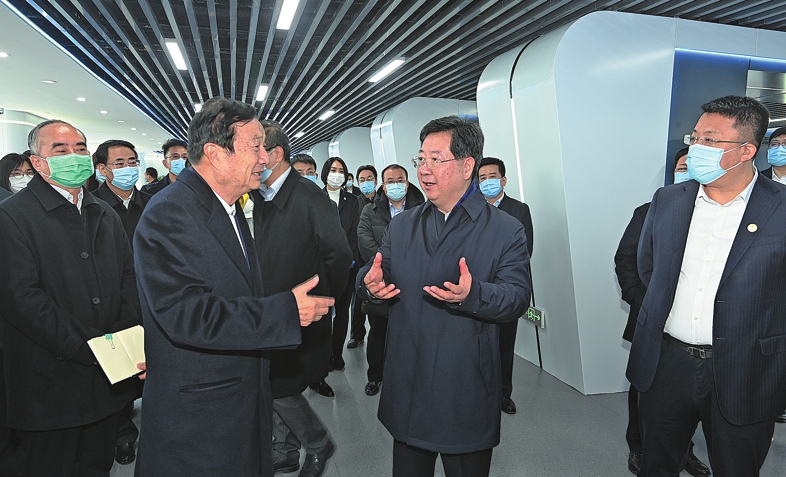Lou Yangsheng (front, second from right), Party secretary of Shanxi province, and Ren Zhengfei (front, third from right), visit the new smart mining tech lab in Taiyuan, Shanxi province.LI LIANJUN / FOR CHINA DAILY