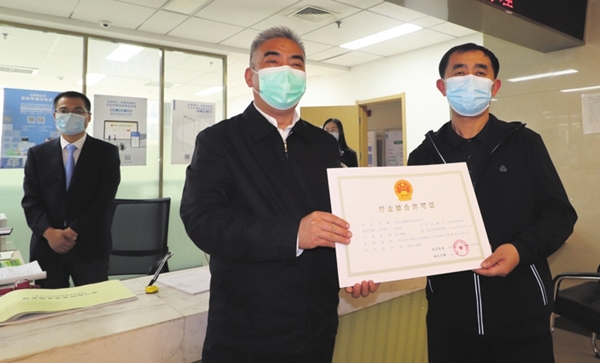 A drugstore owner is granted a certificate for selling medicines and medical equipment by the Jinzhong administrative service bureau. ZHENG YANBO / FOR CHINA DAILY