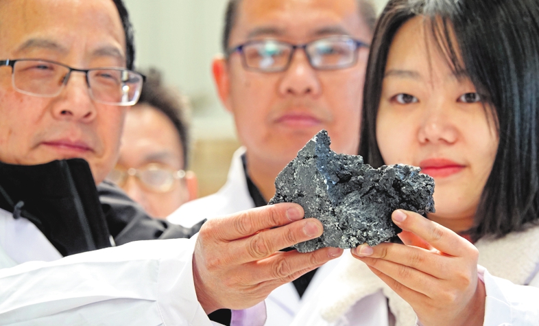 Researchers at an institution in Taiyuan show a piece of composite material developed from coal. Liu Tong / For China Daily