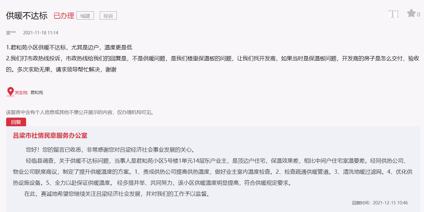 2021年11月18日,有網友在人民網“領導留言板”留言,反映自己所居住的山西省呂梁市臨縣君和苑小區供暖不達標的問題。