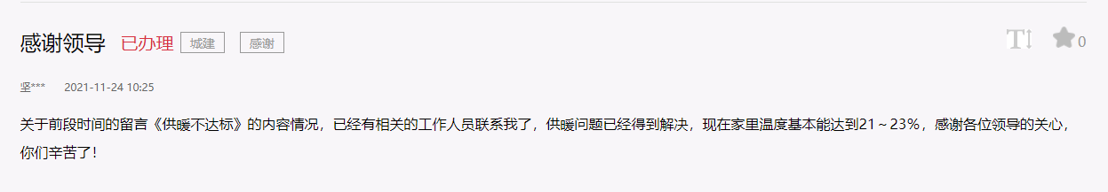 2021年11月24日,這位網友再次在“領導留言板”留言,對上次留言的辦理結果表示滿意。他在留言中說:關于前段時間留言反映“供暖不達標”的情況,已有相關工作人員聯系了我,供暖問題已經得到解決,現在家里溫度基本能達到21至23攝氏度。他同時對留言辦理和處置單位表示了感謝。