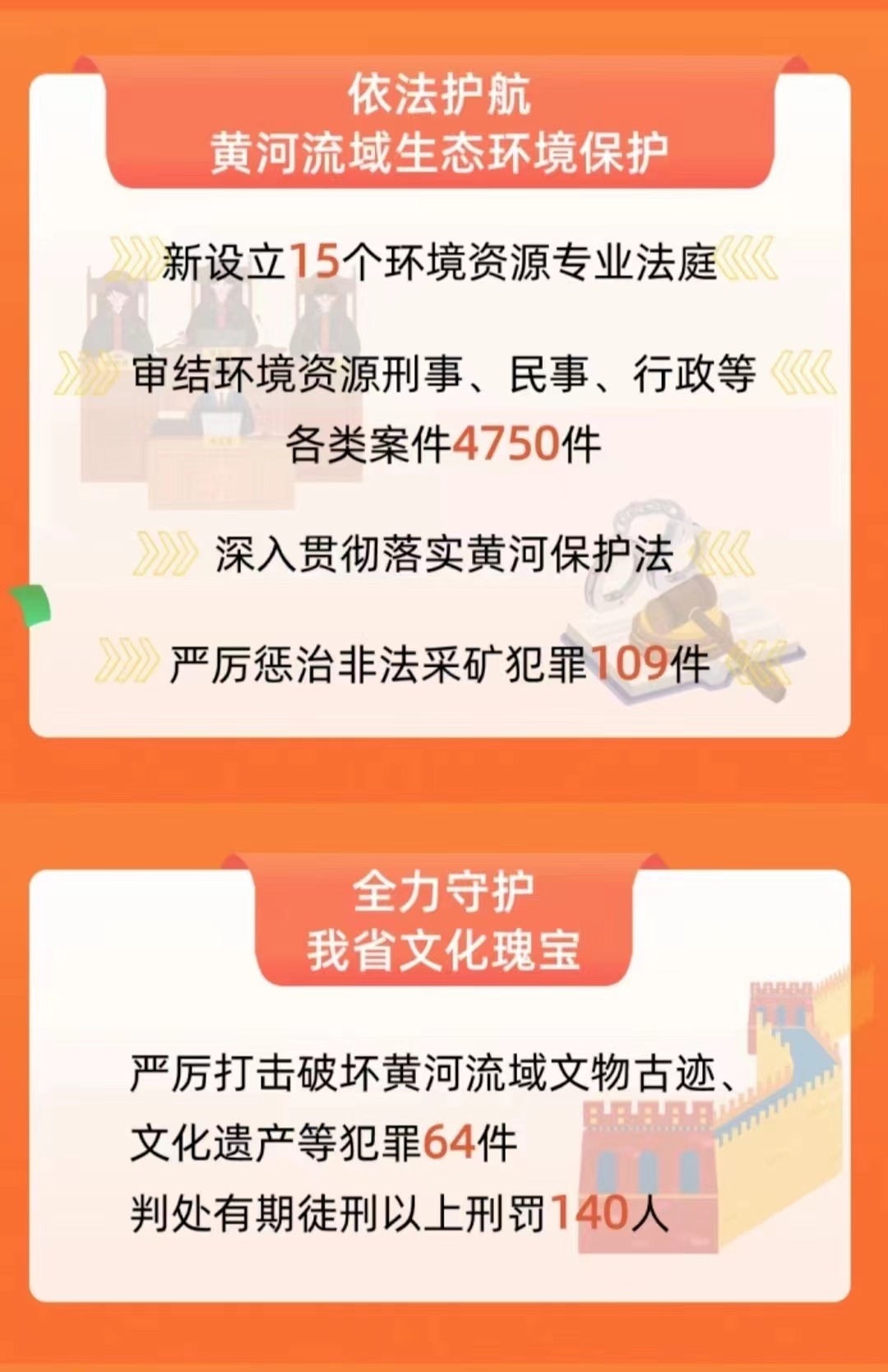 山西是黃河流域的重要省份,也是文物文化大省。保護生態環境,山西法院不是一判了之,而是堅持教育、懲罰、恢復等多重手段并舉。過去一年,山西法院建立多個生態環境司法保護基地加強宣傳保護,嚴厲打擊破壞黃河流域文物古跡、文化遺產等犯罪64件,判處有期徒刑以上刑罰140人。審結環境資源刑事、民事、行政等各類案件4750件。