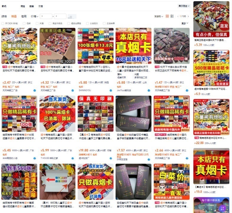 網絡購物平臺上更可找到大量貨源,頁面上還多標有“保真”“小朋友都喜歡”“讓孩子遠離手機”“來來來比誰多”“讓孩子有面子”之類的宣傳語,一些店家主推“稀有卡”“絕版卡”,累計銷量幾千上萬的網絡店鋪不在少數。商品評論中,“幾元錢買到孩子心坎里”“孩子玩得很開心”“煙卡是真的,還送了好幾個”之類,好評如潮。