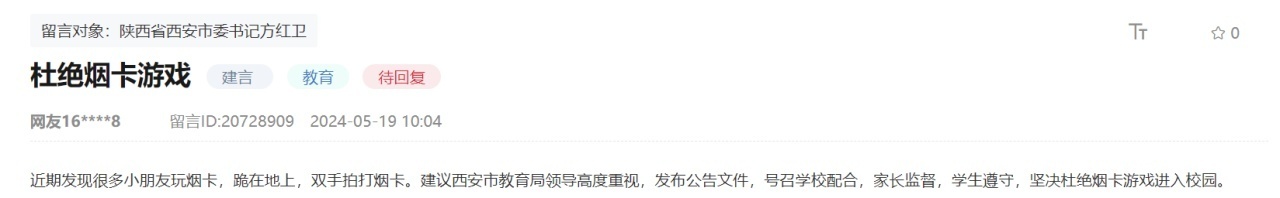 太原市享堂西街小學、運城市垣曲縣七一小學、陽泉市朝陽小學校等紛紛發布《致家長的一封信》,言明煙卡游戲背后潛藏的危害,呼吁家校聯手引導教管,嚴防學生沉迷煙卡。臨汾市鄉寧縣教育科技局也于近日發布了《關于防止沉迷“煙卡”游戲的重要提示函》。