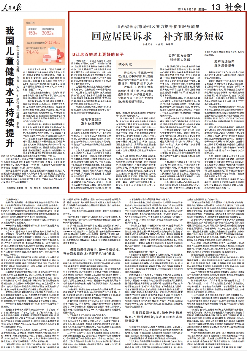 在管、評、調等方法多措并舉下,2024年以來,潞州區全區受理物業投訴量同比減少33%,解決居民投訴物業問題2070件,居民生活幸福感不斷提升。