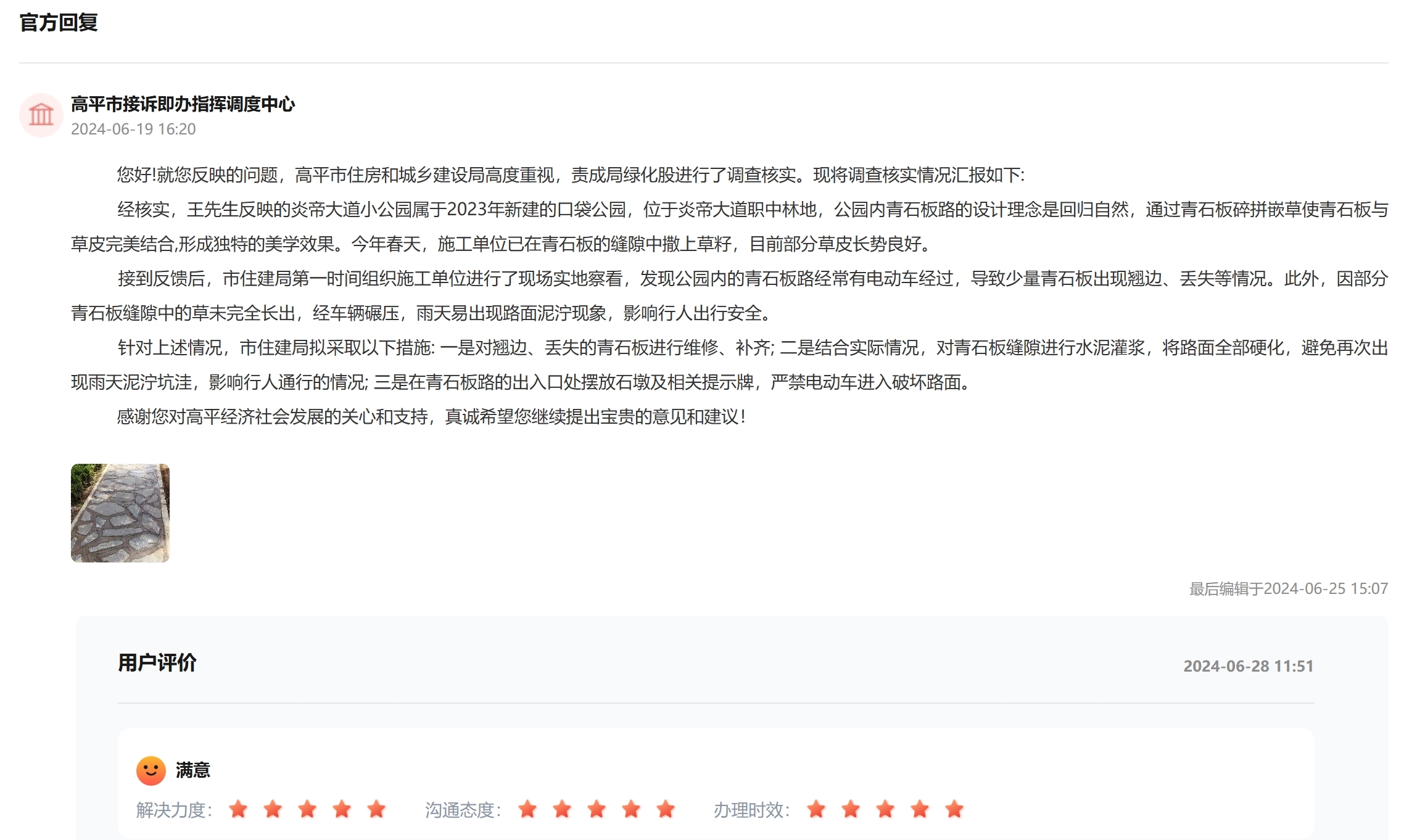 通過和網民溝通,了解到網民的訴求后,高平市住建局第一時間組織施工單位去現場察看,發現公園內的青石板路經常有電動車經過,導致少量青石板出現翹邊、部分青石板丟失等情況。此外,因部分青石板縫隙中的草未完全長出,經車輛碾壓,雨天易出現路面泥濘現象,影響市民出行安全。