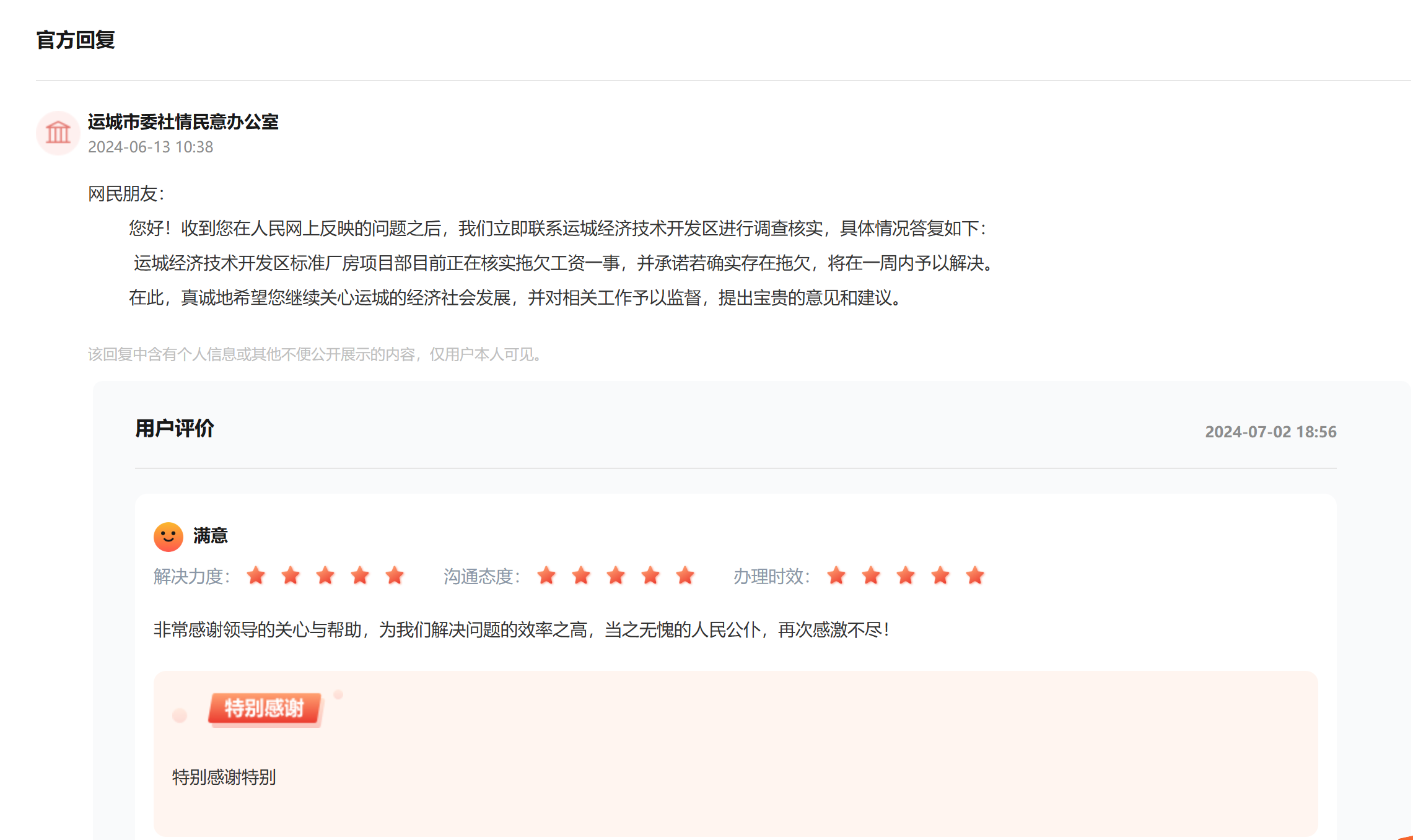 人民網太原7月7日電(田小麗)“被拖欠的工資全額到賬了,感謝平臺解決問題效率之高,也感謝辦事領導幫我們討回血汗錢,特別感謝!”7月5日,山西運城的王先生說起欠薪到賬,一連三個“感謝”道出激動心情。