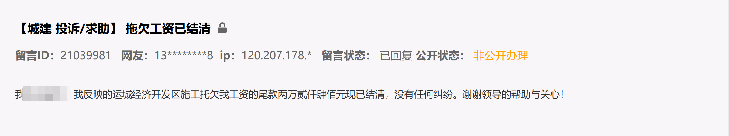 6月30日,收到全部工程款后,王先生第二次在人民網“領導留言板”留言,“尾款已結清,沒有任何糾紛。謝謝領導的幫助與關心!”