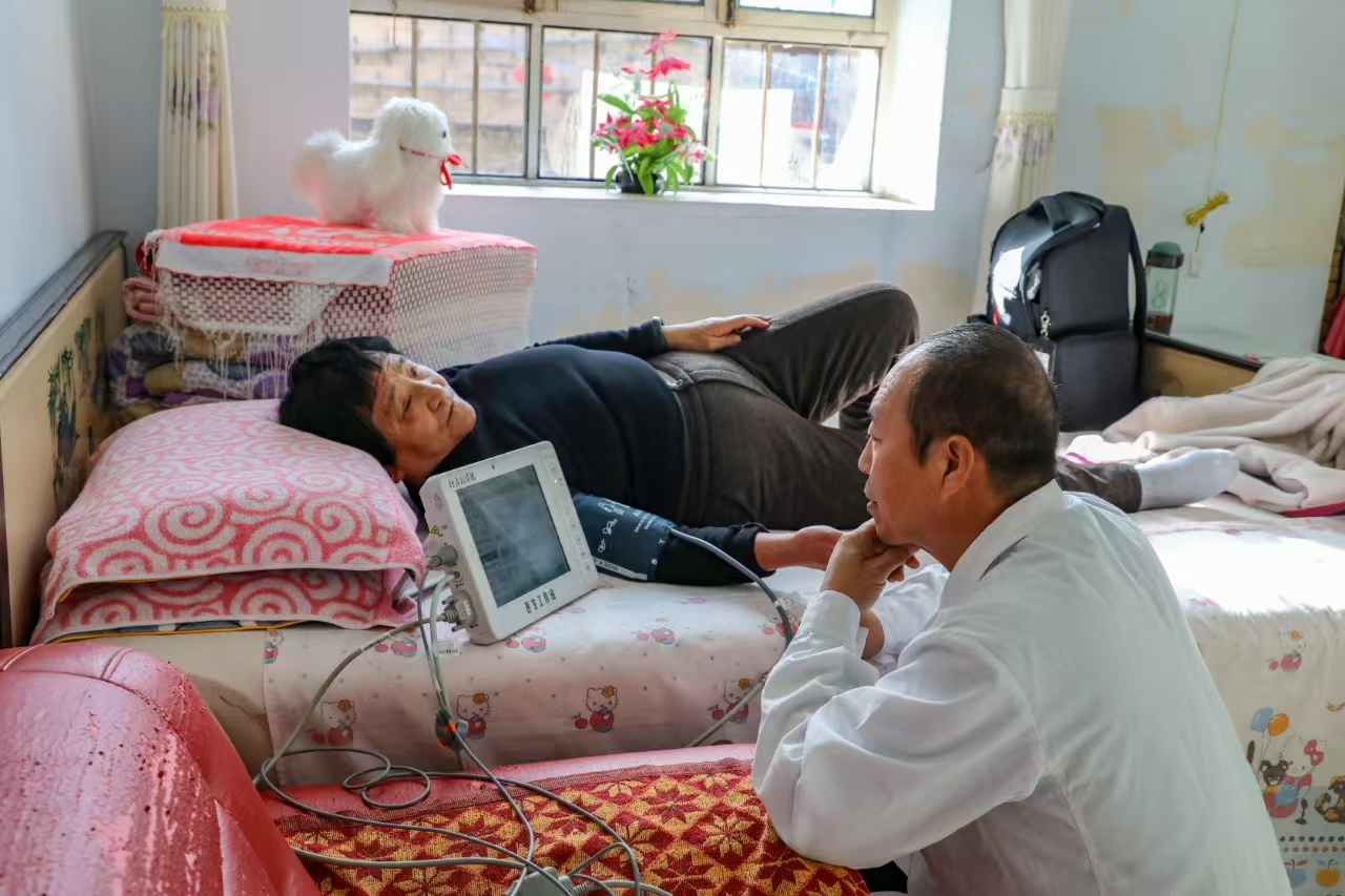冬日的早上愈發寒冷,晉城高平市北城街街道上扶村的村醫張建明早早來到村衛生室,將助診包的儀器設備整理好,按照約定的時間,背上“背包”上門為村民王永花復診。