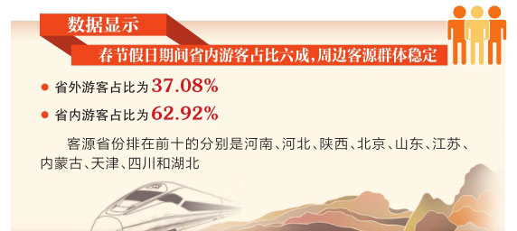 數據顯示,春節假日期間省內游客占比六成,周邊客源群體穩定。省外游客占比為37.08%,省內游客占比為62.92%,為春節假日主要客源??驮词》菖旁谇笆姆謩e是河南、河北、陜西、北京、山東、江蘇、內蒙古、天津、四川和湖北,其中四川首次進入我省假日客源TOP10之列。