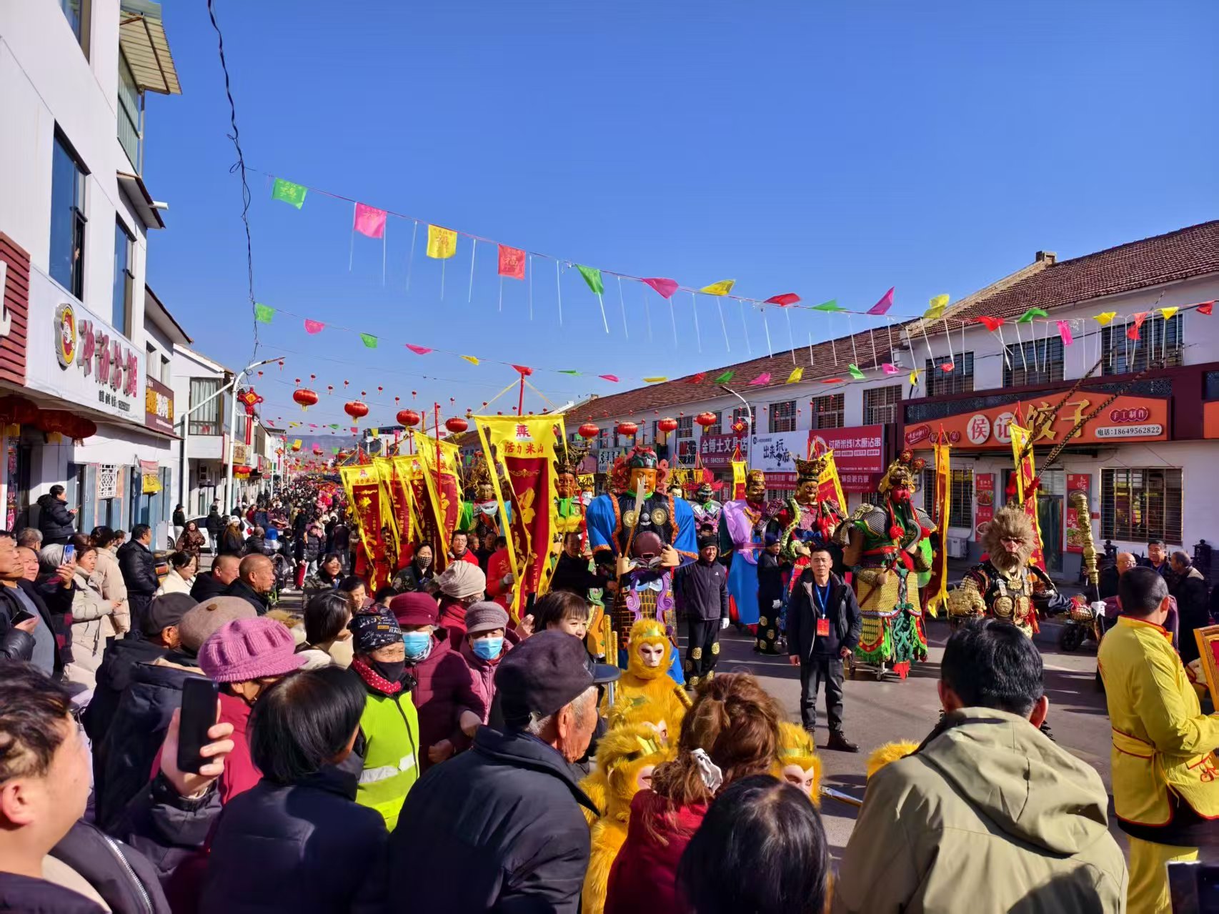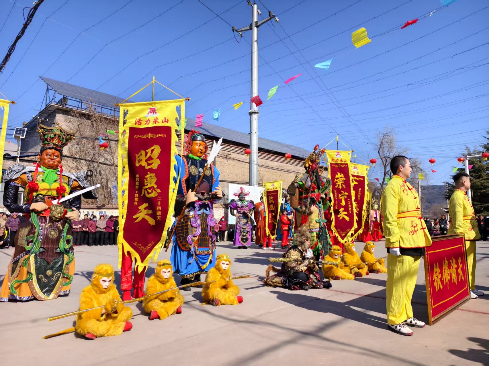 當日下午1點,伴隨著震天的鑼鼓聲和歡快的嗩吶聲,24位身著華麗服飾的“諸天神像”精彩亮相,一尊尊高達3米的“神像”都由村民們精心裝扮而成,他們邁著穩健的步伐,或手持法器,或腳踏祥云,神態莊嚴,栩栩如生。