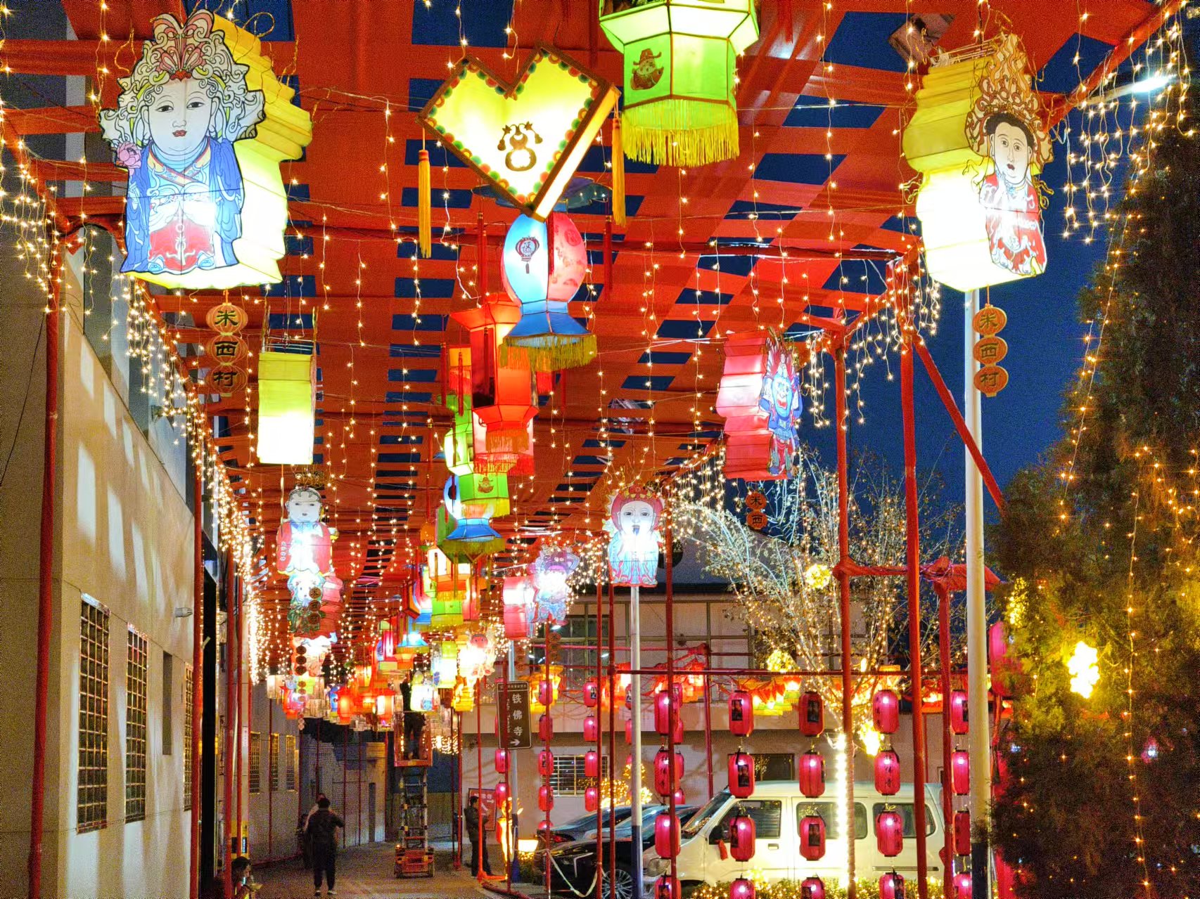 夜幕降臨,米西村傳統手工花燈和二十四諸天造像彩燈點亮,年味溢滿村巷。柔和燈光透過特制燈罩,映照出諸天菩薩的輪廓,仿佛訴說著往昔歲月的傳奇故事。游客們穿梭在花燈下,賞花燈、游古建、品年俗,感受著非遺中國年的熱鬧與紅火,濃郁的年味兒更有了文化氣息。