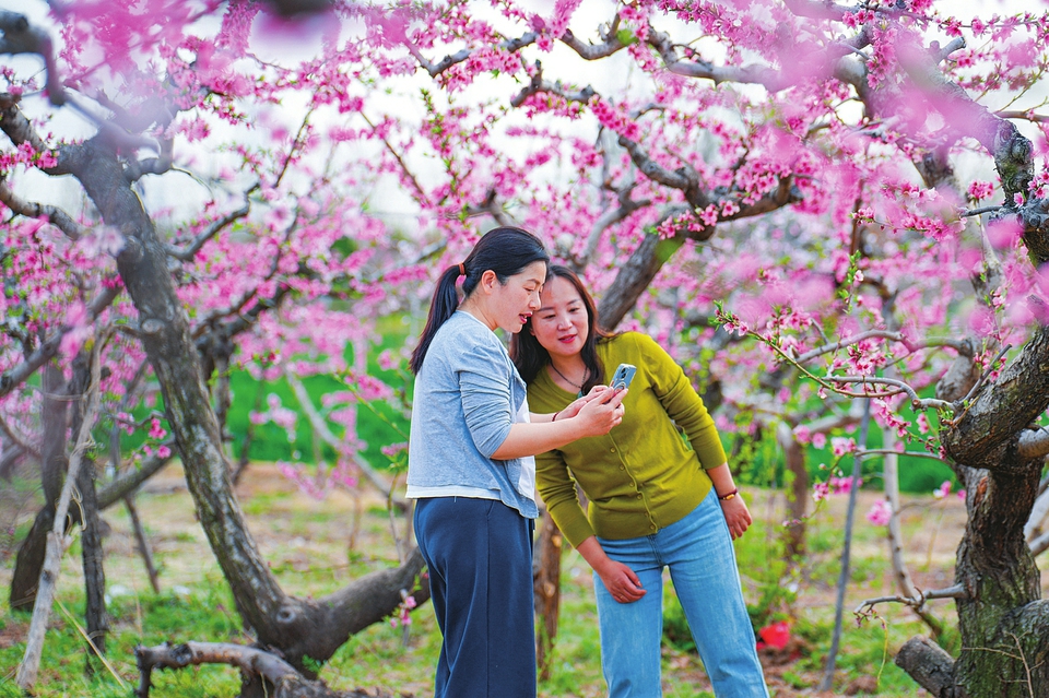 4月6日,游客在平陸縣部官鎮桃林中拍照打卡。春日暖陽下,萬畝桃花競相綻放,如云似霞,吸引了眾多游客前來賞花拍照,感受盎然春意。(陳方斌攝)