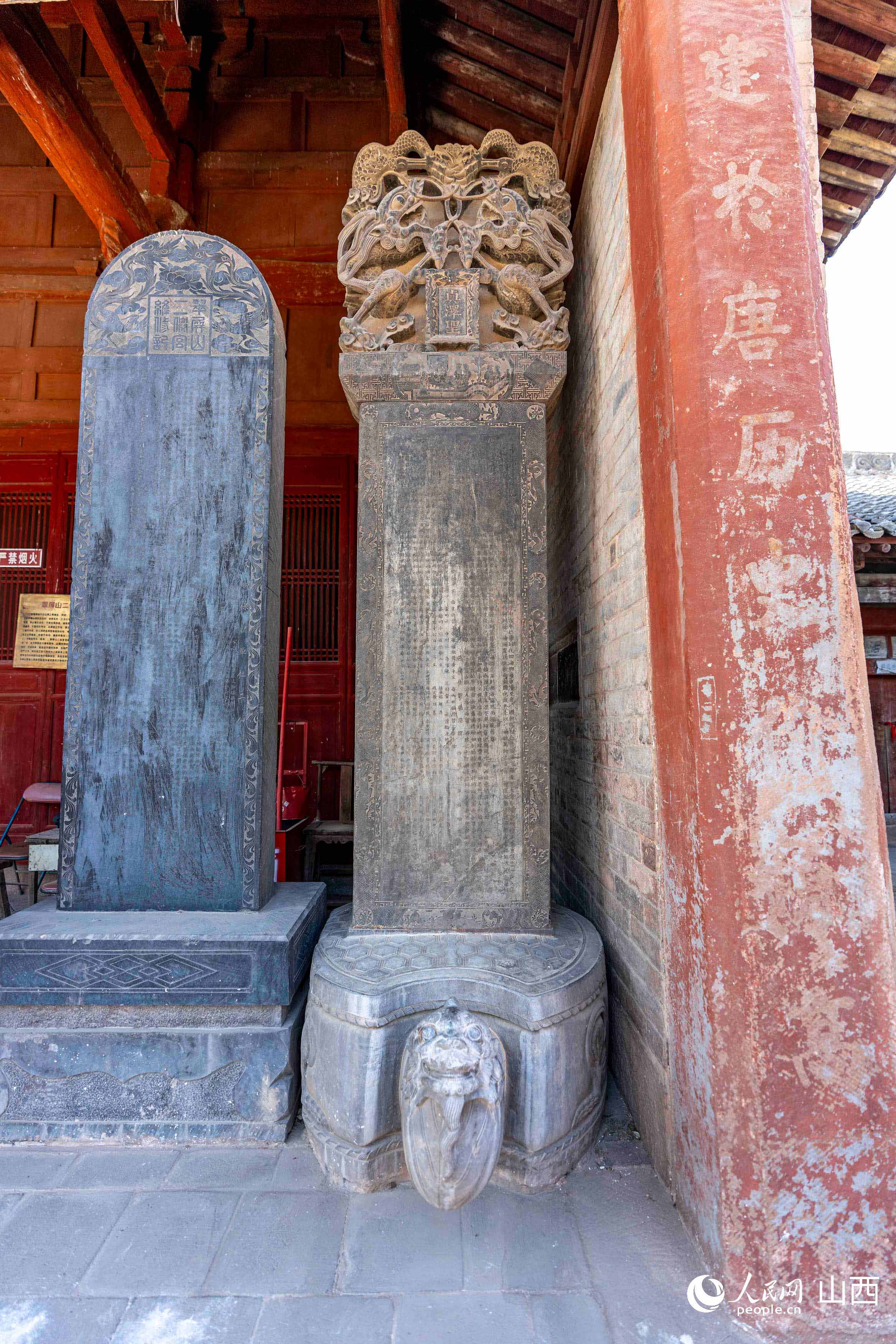 過月臺仰望正殿,前檐方形抹角石柱側腳明顯,據明萬歷二十九年《重修二仙宮碑記》記載:“創自唐昭宗天佑之末年也,其來遠矣”,結合在正殿須彌座神臺發現的金大定十二年題記石碑,可確認其主體建筑為金代遺構。