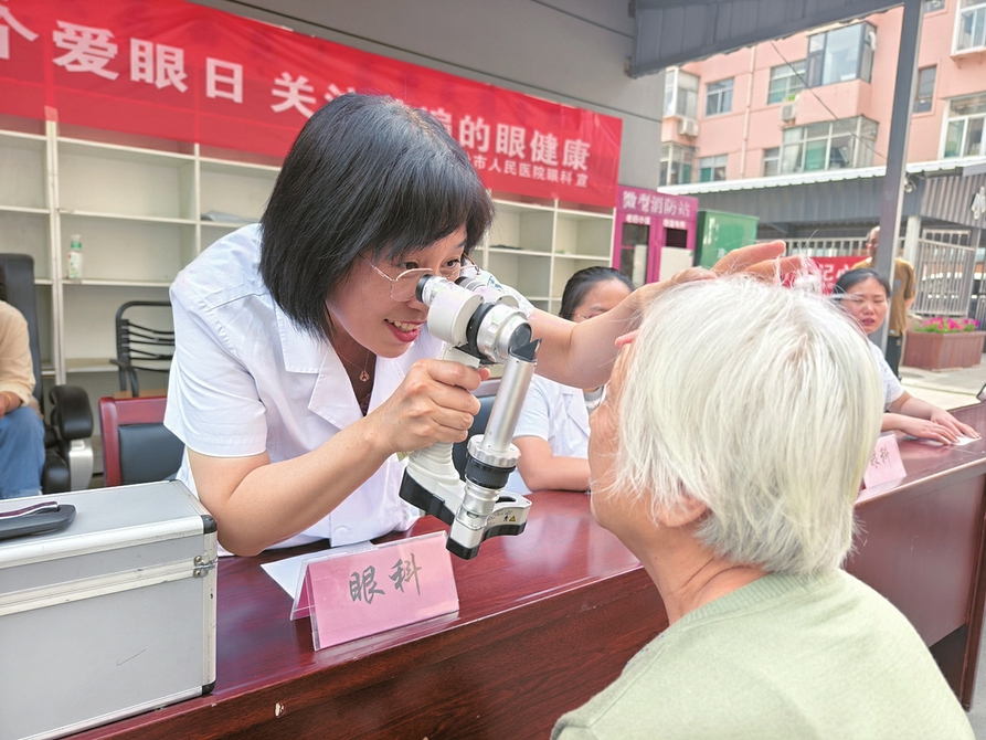 6月5日,臨汾市人民醫院眼科醫護人員走進堯都區水塔街辦事處陽光社區,為居民免費做眼科檢查、講解眼病知識、發放保健資料,并解答居民提出的相關問題。(張向東 攝)