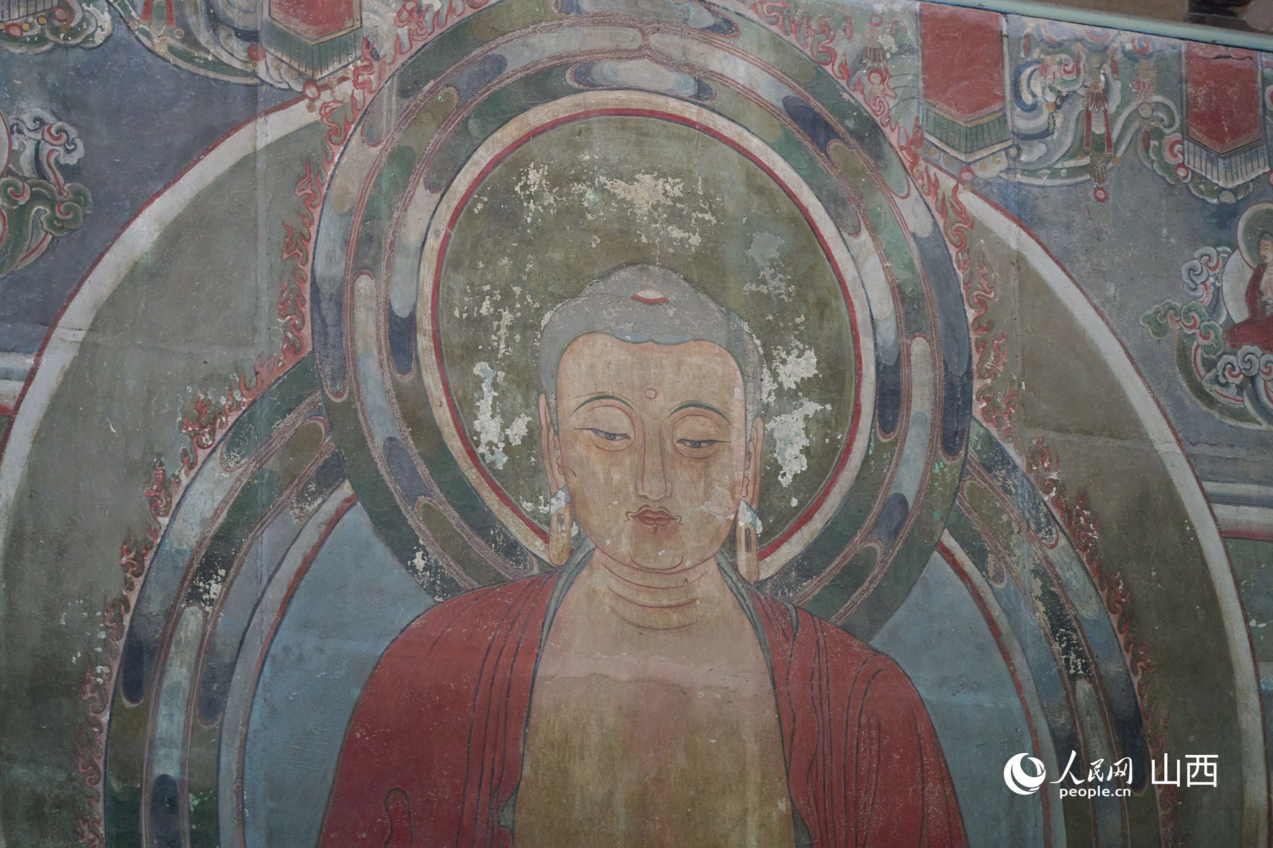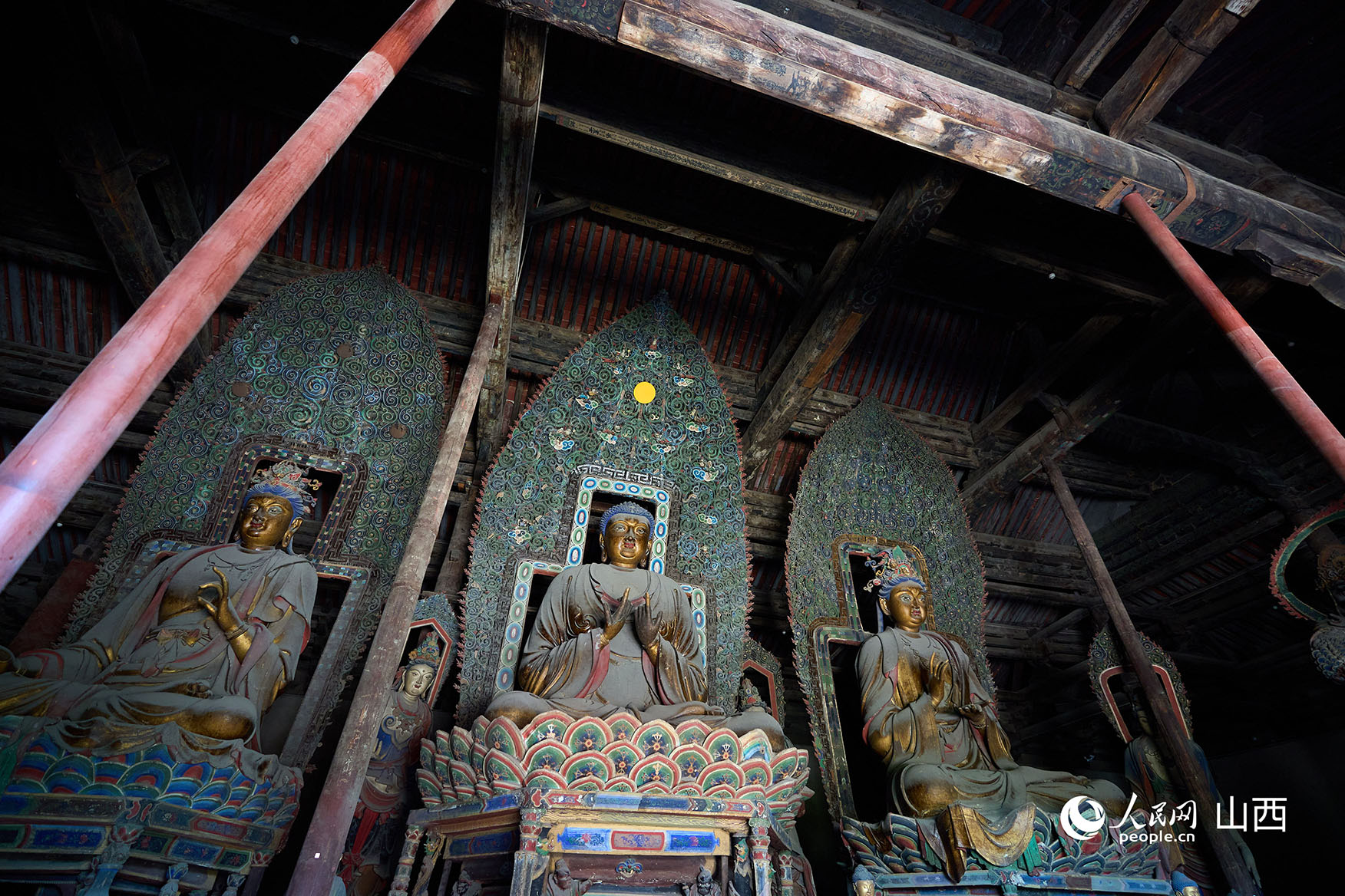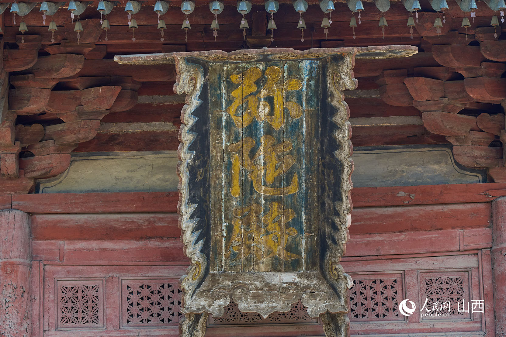 崇福寺核心瑰寶當屬金代原構彌陀殿。彌陀殿(1143年建)作為金代木構巔峰之作,面闊七間、氣勢雄渾。殿內更匯聚“金代五絕”:其一是高1.5米的琉璃力士昂首屋脊,近似真人,是中國遼金建筑中最高、最大的脊剎琉璃武士;其二是殿門懸掛的金代漢字“彌陀殿”原匾,高4.2米,寬2.7米,每個字直徑達0.9米,是遼金最大的華冊式牌匾;其三是15種雕花門窗欞紋,巧奪天工,是中國現存下來最完整的金代雕花欞窗;其四是殿內的9尊彩塑,其中三尊主像高9米以上,寶相莊嚴,塑像背光采用縷空泥塑彩繪而成,工藝高超;其五是327平方米的水陸壁畫,畫面氣勢宏偉,圖案莊嚴,畫藝工整,線條有力,是一幅難得的金代佛傳水陸畫卷。