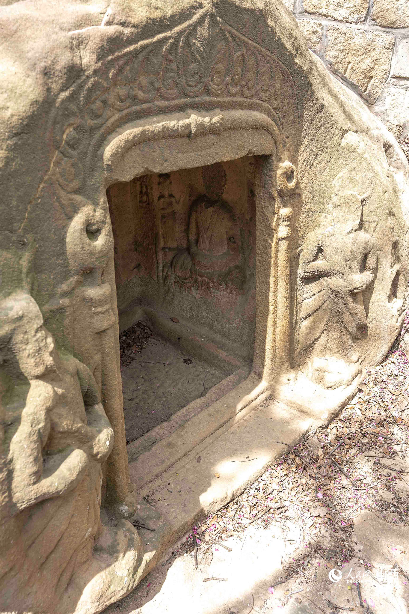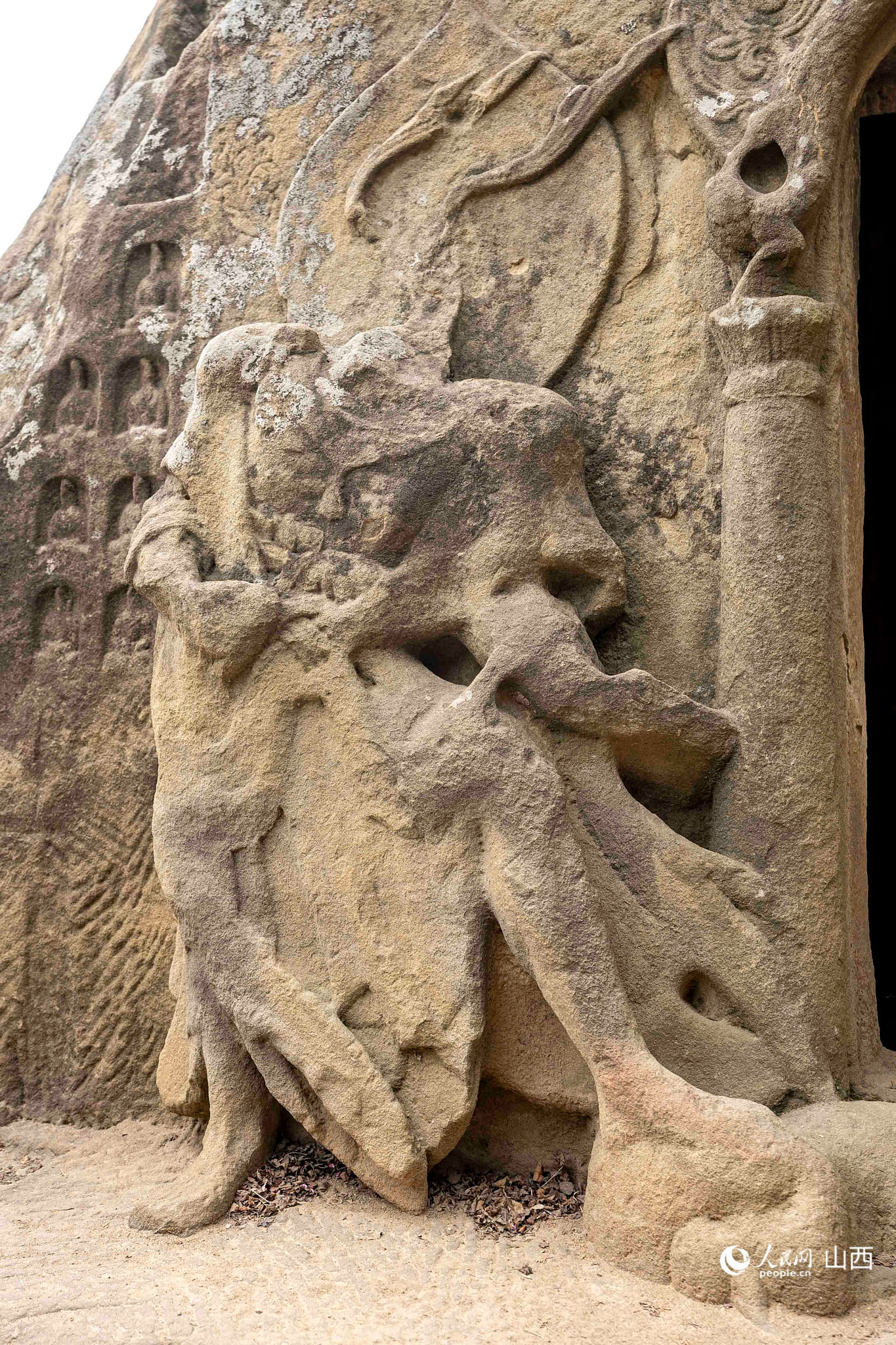 這方砂巖鑿就的藝術圣殿,處處盡顯文明交融之痕跡。門楣處的忍冬紋飾,葉脈間暗藏佛教傳播與藝術本土化的復雜進程。殘存的力士造像足踏獅象設計,巧妙融合印度佛教象征體系與中國門神文化傳統。