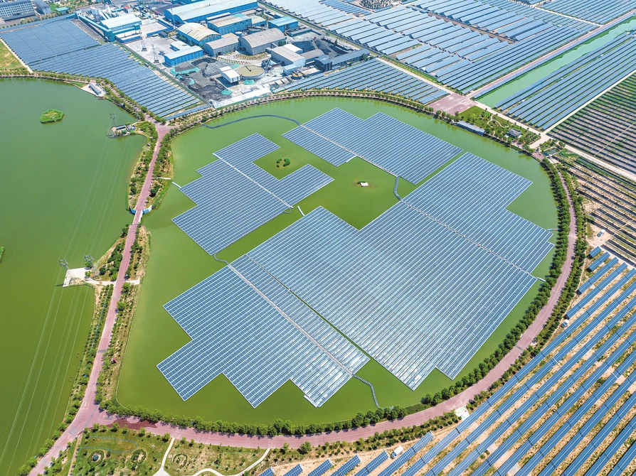 近日,晉南鋼鐵集團萬畝太子湖,一排排光伏板整齊排列,在陽光映照下熠熠生輝,呈現出一幅壯美的生態畫卷。(薛俊攝)