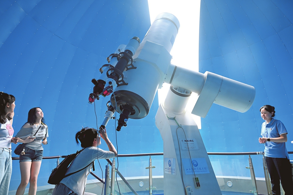 7月9日,山西省科技館內,市民正在天文觀測臺使用天文望遠鏡觀測宇宙。據了解,天文觀測臺按照太原市的地理經緯度定位設計,內設一臺有效口徑400mm的施密特-卡塞格林折反射式天文望遠鏡,配備自動尋星系統,可高精度自動跟蹤目標星體,是我省重要的天文科普基地。(記者阮洋攝)