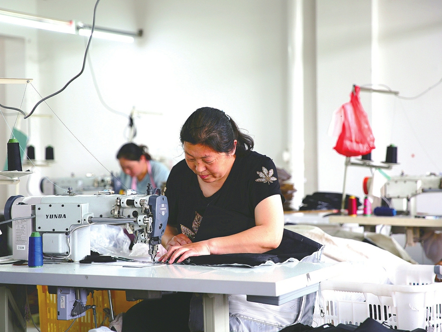 7月7日,方山縣圪洞鎮二期易地搬遷安置區內的幫扶車間里井然有序,員工們在流水線上熟練地趕制衣服訂單。據了解,該幫扶車間可吸納近200名婦女就地就業,年收入可達1.5萬元,實現了家門口就業,家門口賺錢。(肖繼旺 攝)