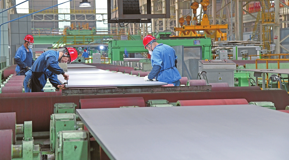7月16日,中國寶武太鋼集團不銹熱軋廠各班組圍繞各自競賽關鍵指標展開比拼。圖為職工在“提質增效勞動競賽”中巡檢產品質量。(王旭宏 攝)