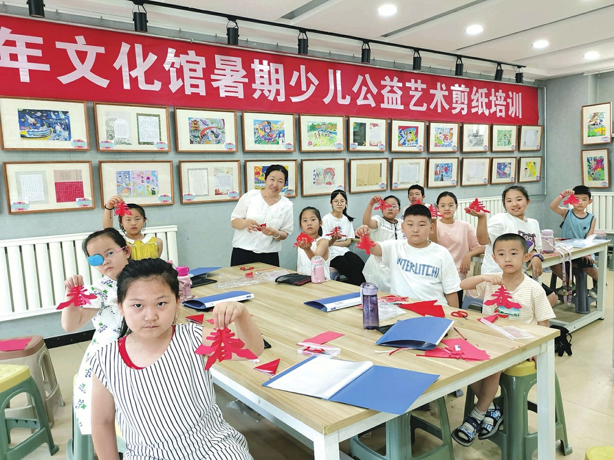 7月16日,孩子們在文水縣文化館展示自己的剪紙作品。該館暑期開設免費培訓班,讓孩子們在動手制作中感受中國傳統文化的獨特魅力。(馮增清攝)