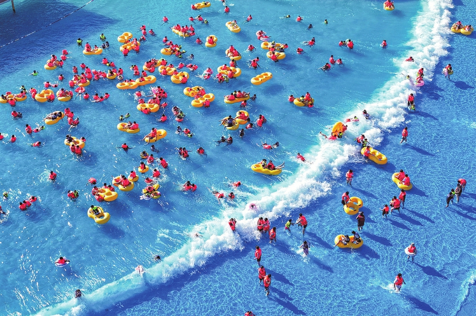 7月28日,聞喜縣一家水上樂園內,游客盡情享受愜意與涼爽。進入暑期,當地依托水上運動項目,打造集娛樂、休閑、餐飲、購物于一體的綜合消費場景,激活“清涼經濟”。(常奇攝)