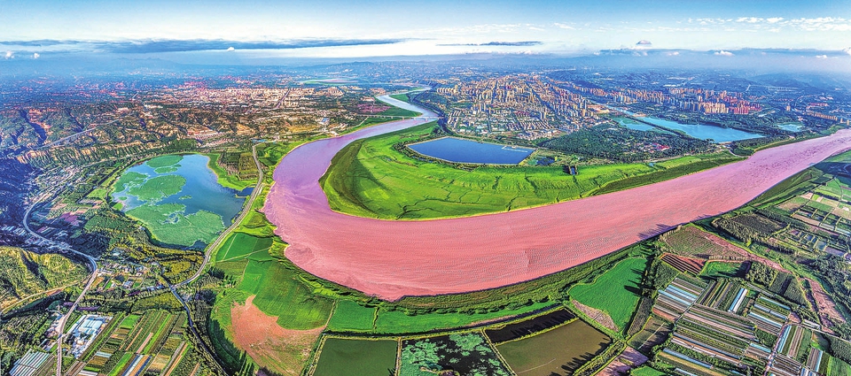 金秋時節,空中俯瞰平陸縣境內黃河岸畔,奔騰的黃河、即將收獲的秋糧作物與美麗新村彼此映襯,共同織就秋日獨有的自然生態長卷。(薛俊 攝)