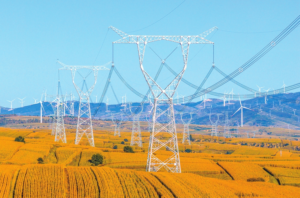 仲秋時節,朔州市向陽堡鄉,高聳林立的特高壓鐵塔與金色的大地交相輝映,構成一幅獨具秋韻的美景。圖為9月28日拍攝的1000千伏鄂岳一二線特高壓線路。(薛俊 攝)