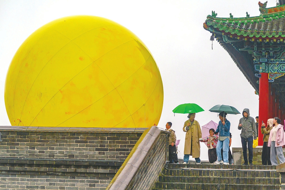 ①10月6日,中秋節當日,游客在運城市中心城區的中禁門城墻上冒雨“賞月”。姜樺 攝