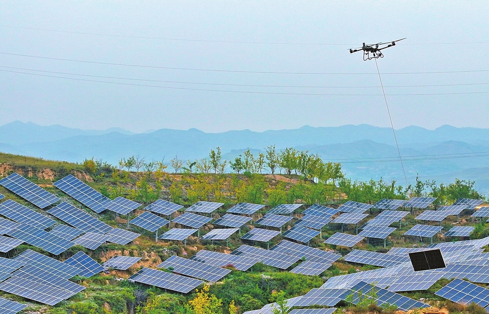 10月8日,神華廣通明錦呂梁柳林100MW農牧光儲復合發電項目石西鄉建設現場,無人機正在吊運光伏面板。該項目為省重點工程項目,采用“光伏+”模式,整合低效土地,結合光伏發電、生態恢復和綠色農業種植,為區域能源結構優化和綠色發展注入新動力。(記者 劉通攝)