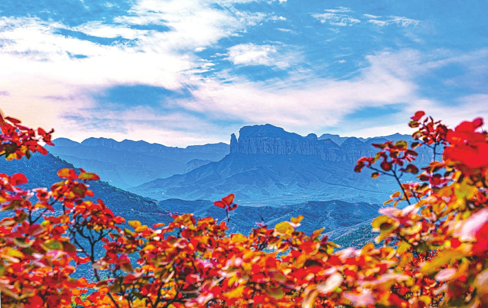 10月22日,黎城縣西井鎮壺山風景區,在早霜的影響下,滿山紅葉層林盡染,繪就色彩斑斕的秋日美景,令人流連忘返。(郭世虎攝)