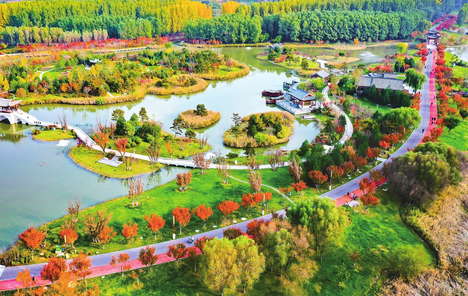 10月26日,長治漳澤湖國家城市濕地公園,五彩斑斕的秋景如詩如畫,吸引市民和游客前來觀賞打卡,享受秋日美好時光。(徐翔攝)