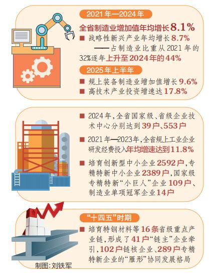 統計數據顯示,2021年—2024年,全省制造業增加值年均增長8.1%,戰略性新興產業年均增長8.7%,占制造業比重從2021年的32%逐年上升至2024年的44%。2025年上半年全省規上裝備制造業增加值增長9.6%,高技術產業投資增速達17.8%,戰略性新興產業對工業增長貢獻率日漸提高。